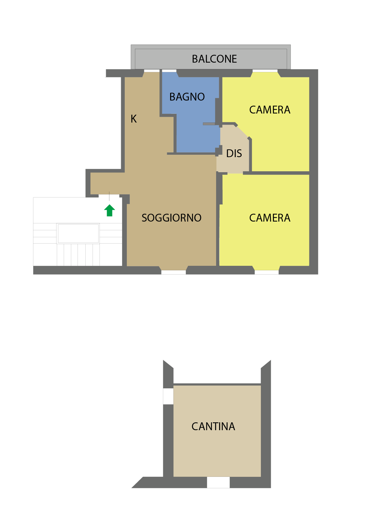ingresso in disimpegno, soggiorno, disimpegno che conduce alla cucina abitabile, camera e bagno con doccia, ripostiglio in quota accessibile da tutti i vani. Completa la proprietà, una cantina al piano interrato e servizio portineria.